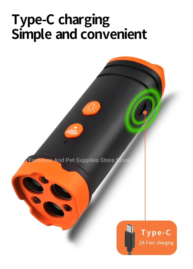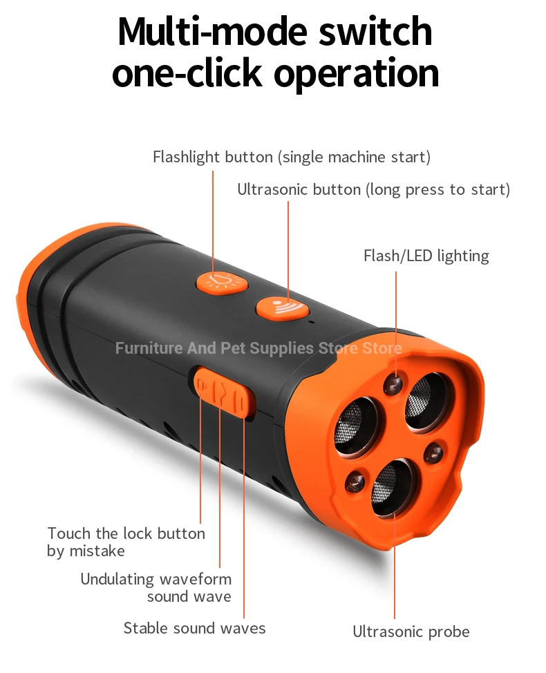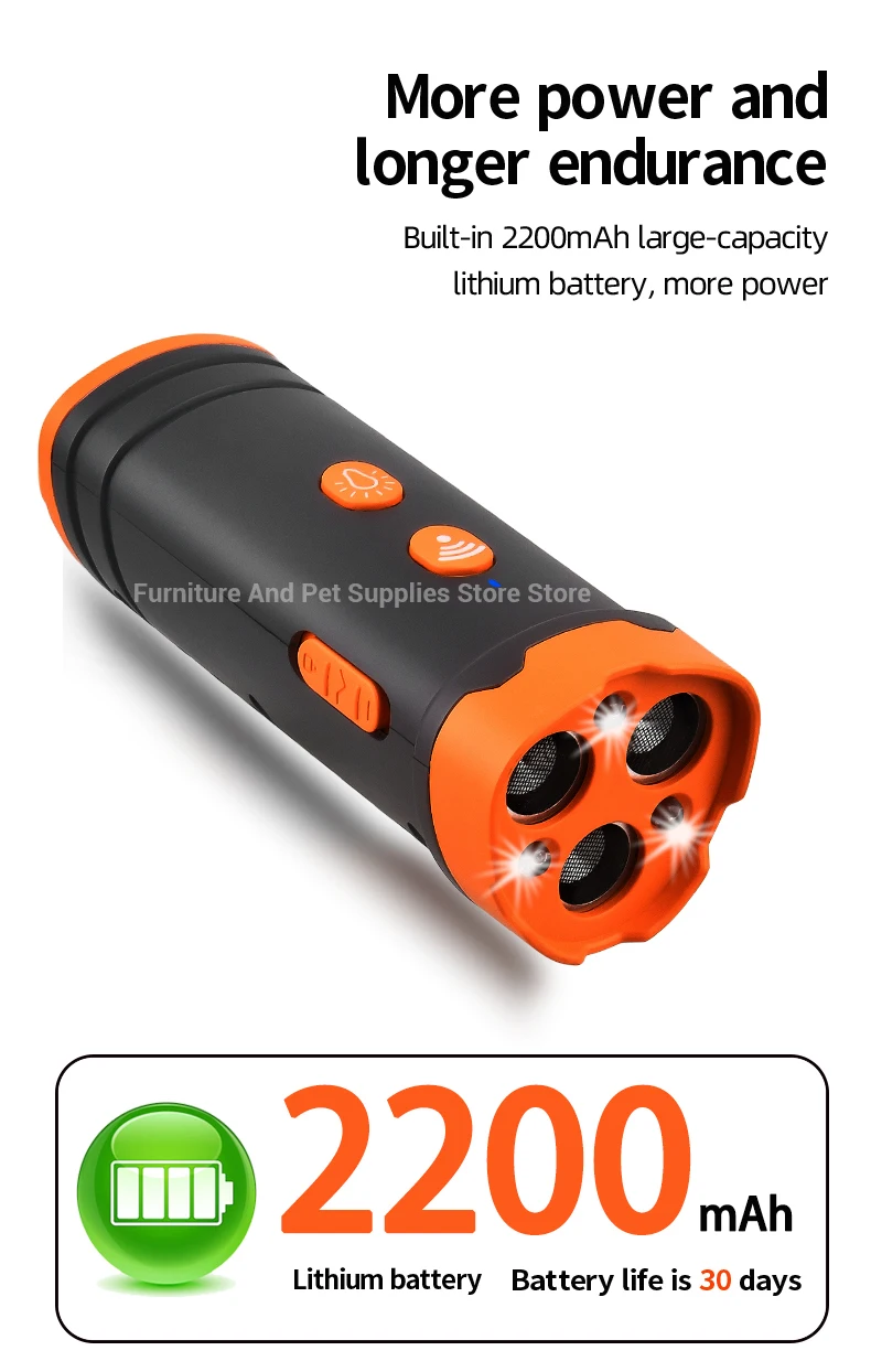 Para iniciar o modo repelente, mantenha pressionado o botão ultrassônico. O dispositivo emitirá ondas sonoras de alta frequência (inaudíveis para humanos), eficazes para corrigir comportamentos indesejados ou afastar cães agressivos de forma segura.